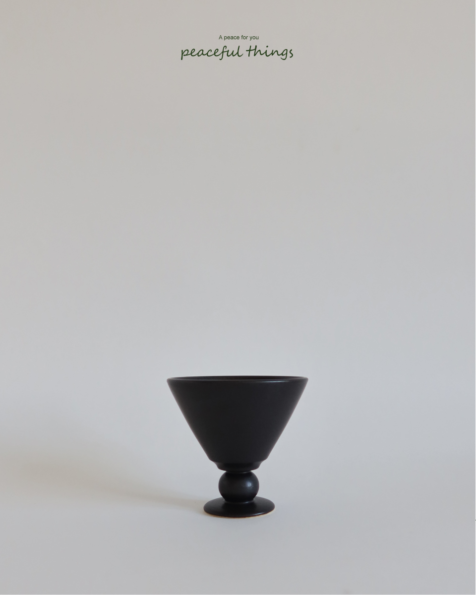 9cm x 10cm / 200ml 피스풀띵즈 세라믹 고블렛 no.03 블랙 색상 입니다. 사선으로 펼쳐지는 나팔 형태의 고블렛 잔 입니다. 매트한 블랙 유약으로 장식되었습니다.