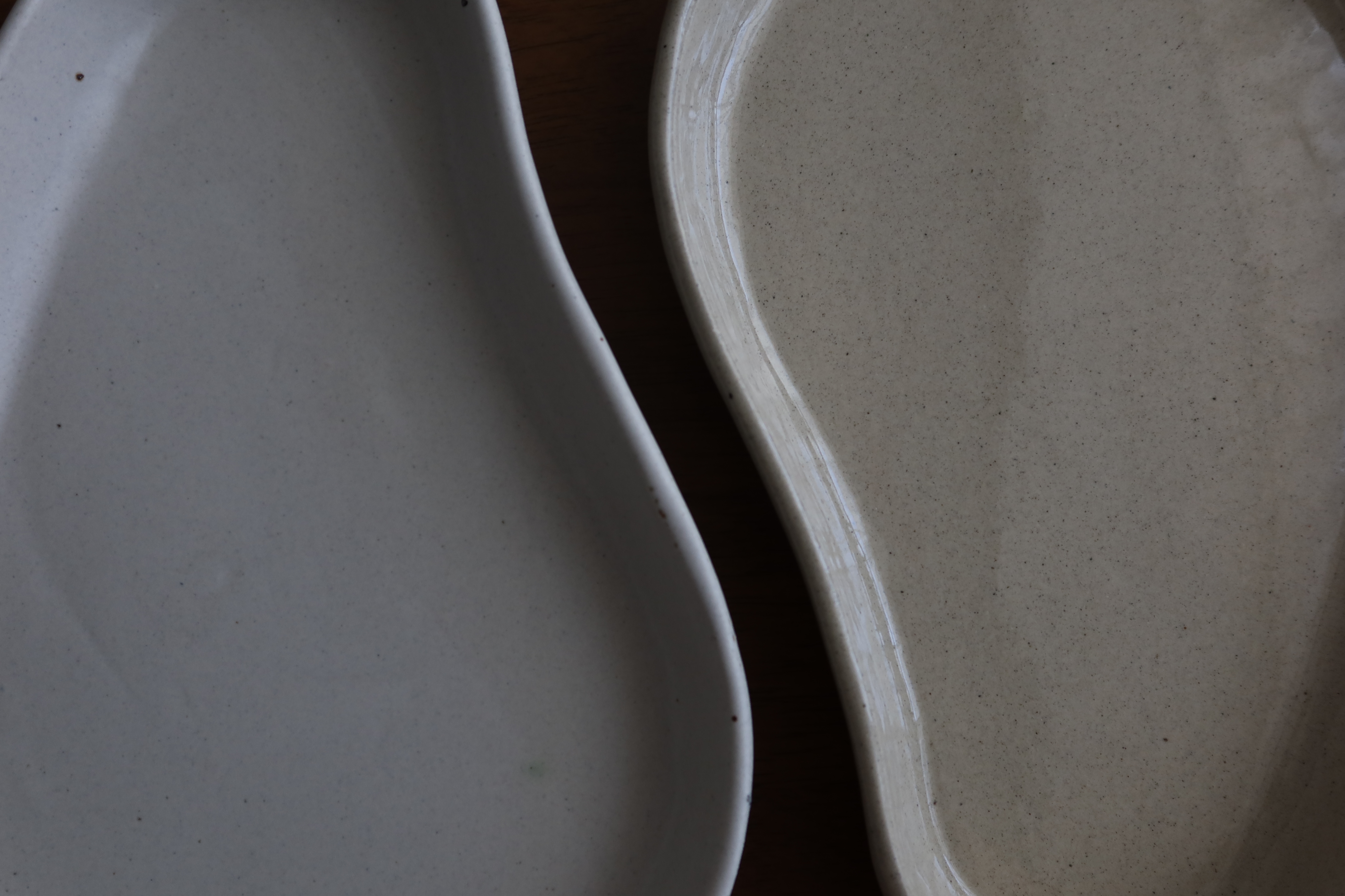 유약 아래로 흙의 질감과 굵은 철 점 (검은색 점)들이 자연스럽게 비치는 표면을 가지고 있습니다.